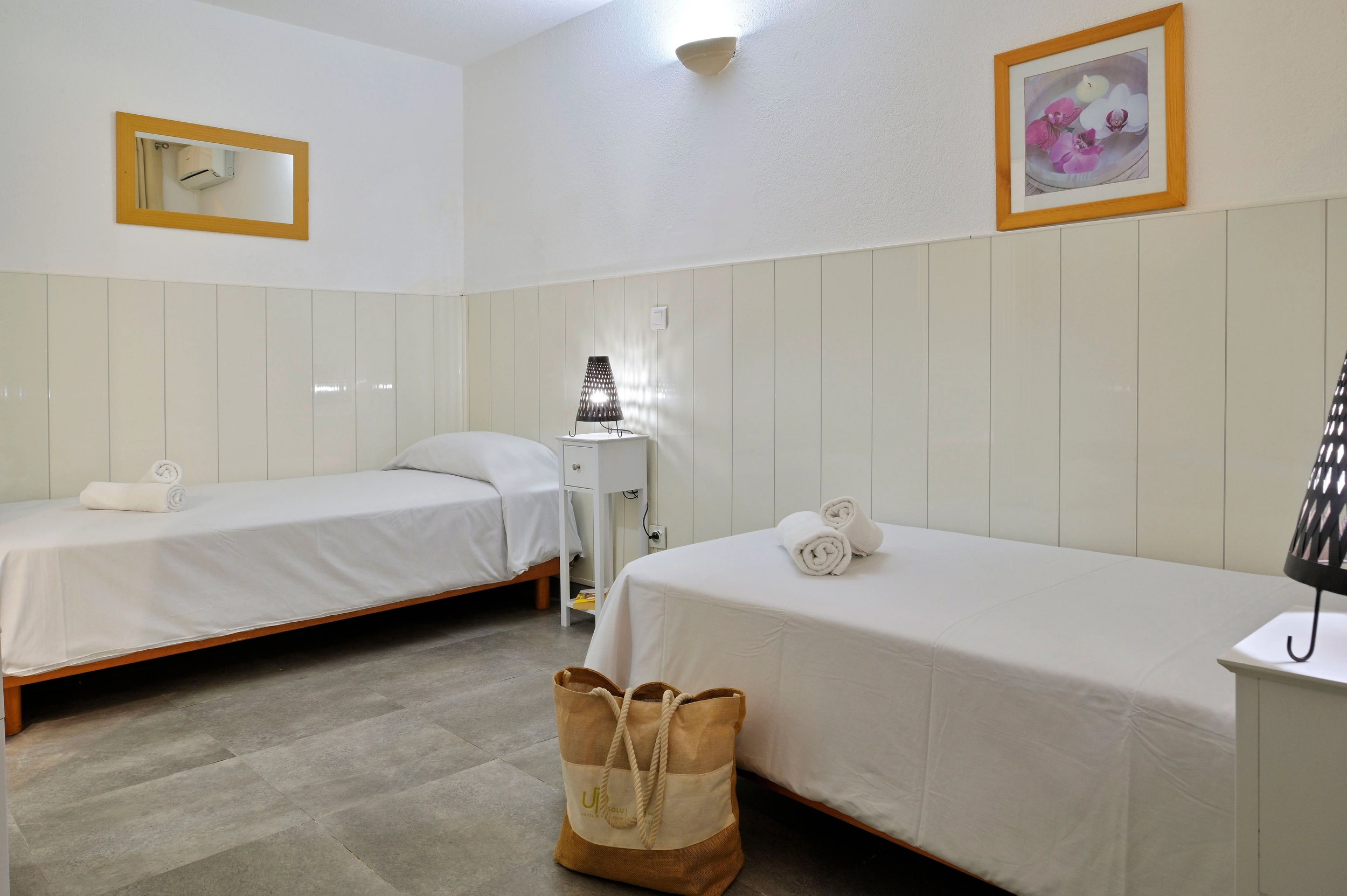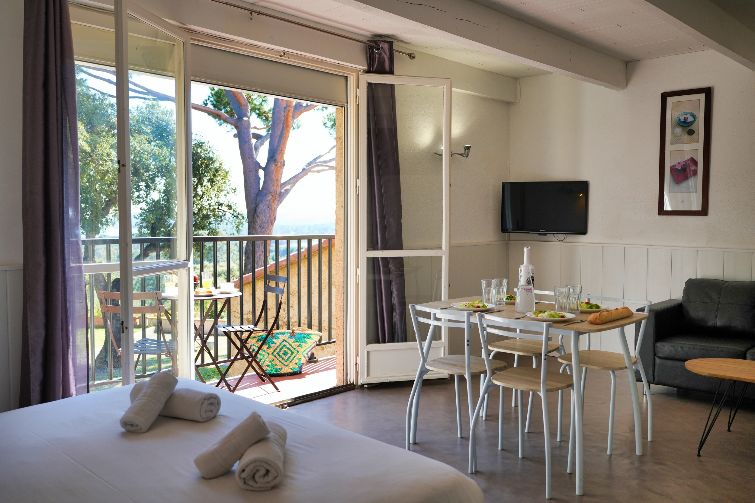 Conçu pour accueillir jusqu’à 4 personnes, le studio « Mezzanine » séduit par son agencement astucieux. À la pièce principale (1 lit 160 ou deux lits 90) s’ajoute une mezzanine aménagée (1 lit 160 ou 2 lits 90), idéale pour deux couchages supplémentaires. Avec ses 30 m² environ, il allie convivialité et confort. Parfait pour les familles ou les petits groupes, il est équipé d’une cuisine complète, climatisation, télévision, wifi et coffre-fort. Terrasse ou balcon selon le niveau, certains offrant une vue sur la mer.